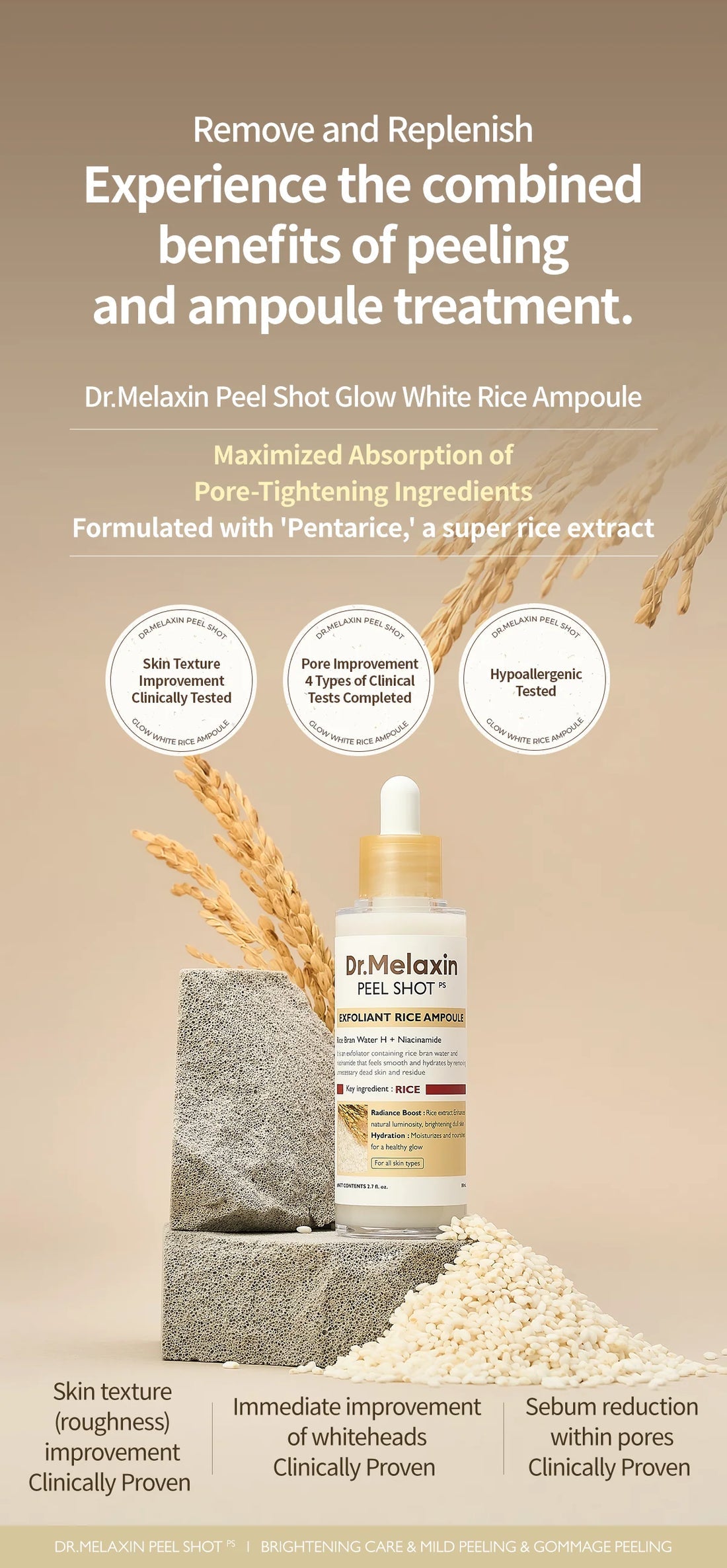 • Our Peeling Ampoule is infused with white rice extract to gently exfoliate and reveal a visibly brighter, more radiant complexion—perfect for dull or uneven skin tone.